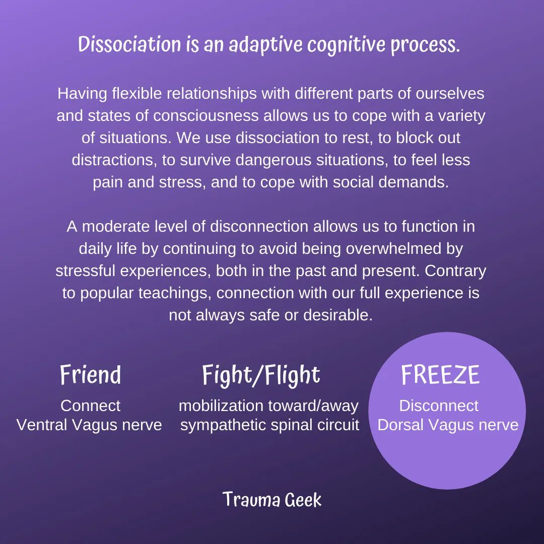 Everyone Dissociates. 13th April 2022 by Richard Bamford A fantastic set of graphics by Janae Elisabeth, informed by Polyvagal Theory. http://traumageek.com/ Thanks to the generosity of Janae Elizabeth @ TraumaGeek.com for sharing her insightful and informative infographics.
